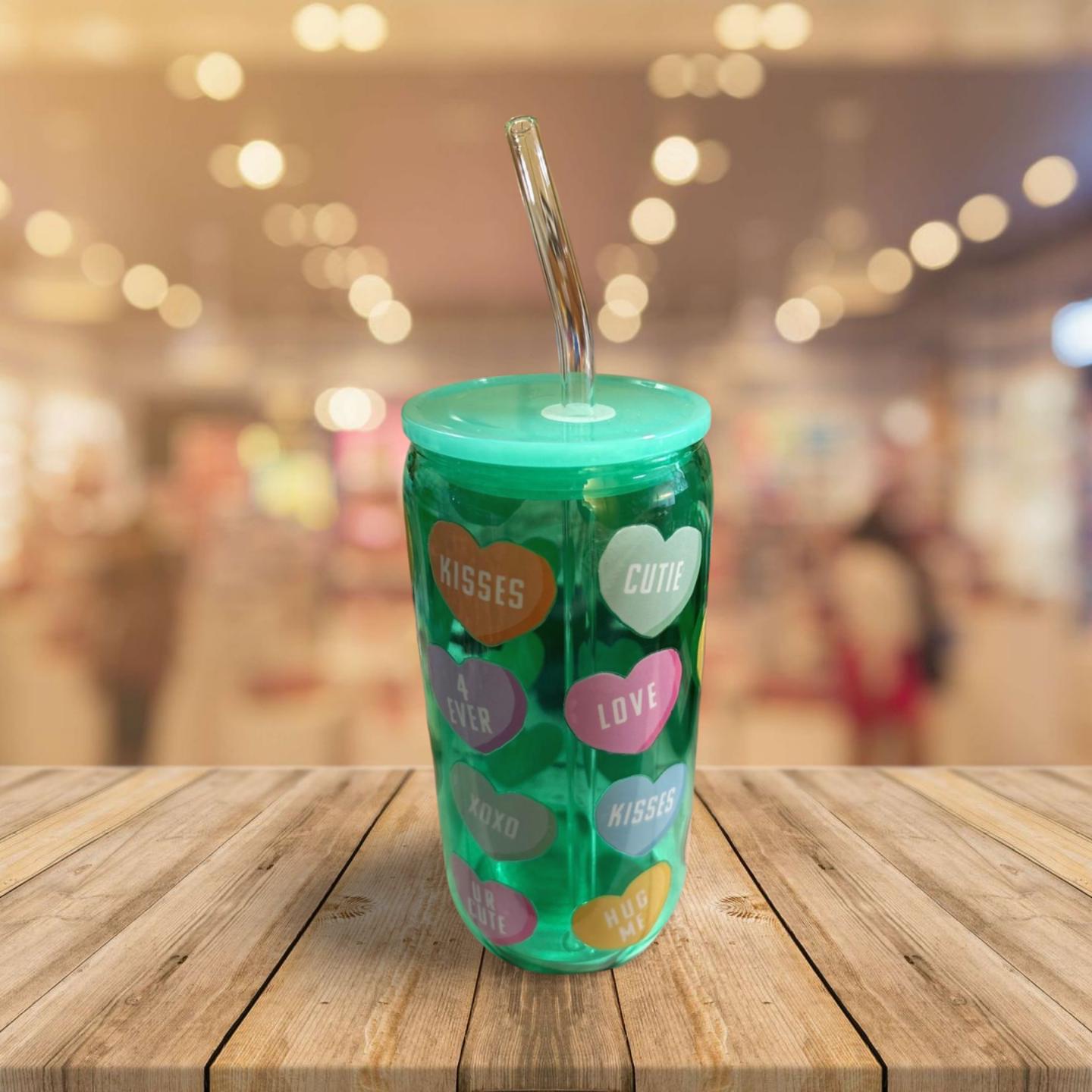 Celebrate the sweetness of life with our 16 oz clear green glass tumbler, featuring a charming Sweetheart Candies design. This delightful tumbler comes with a matching green plastic lid and a clear plastic straw, making it perfect for sipping your favorite beverages in style. Durable and eye-catching, it's a must-have for anyone who loves a touch of nostalgia. Whether you're at home, at work, or on the go, this tumbler is sure to add a pop of fun to your day. Enjoy every sip with a smile!